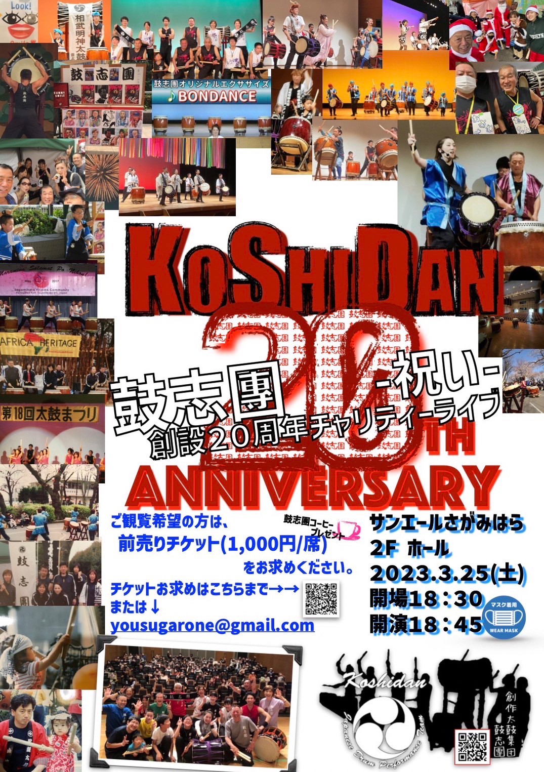 今年で発足20年を迎える相武明神太鼓・鼓志團の演奏を皆様に見ていただきたいと思います…今回は会場の混雑が予想されるため、「前売りチャリティーチケット 1,000円 (鼓志團珈琲パック付)」で開催いたしたいと思いますのでよろしくお願いします…詳細は令和5年1月よりポスター、ホームページでお知らせしておりますのでよろしくお願いします…ご観覧希望の方はポスターの表面とチラシの裏面にあるQRコード若しくは鼓志團メンバーにご連絡いただきたいと思います。