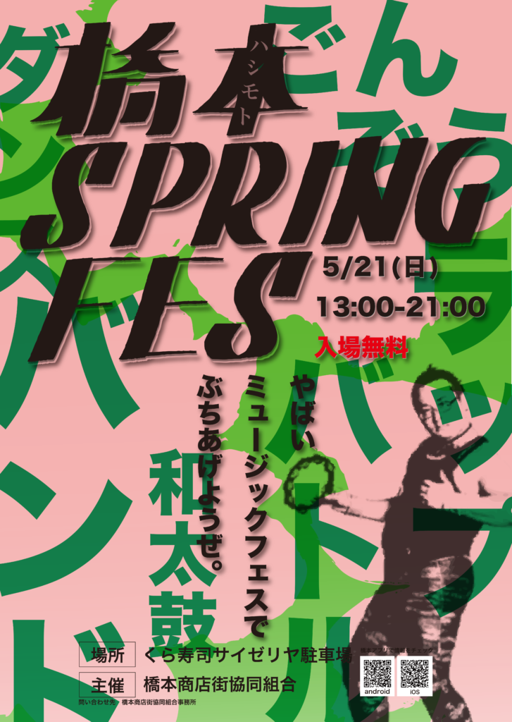 魅力のある橋本の「まちの魅力」を提供・発信する目的に企画された「橋本スプリングフェス」…昨年に続き今年も「くら寿司サイゼリヤ駐車場」で盛大に開催されることとなり…今年もステージイベントのトップで演奏させていただくことになりました…5月19日(日)の12時に出演予定です…昨年は太鼓演奏の他に「鼓志團ラップ」を歌わせていただきましたが (;^_^A 今年は鼓志團オリジナルの「KOSHIDAN 盆 DANCE」で盛り上げて行きたいと思いますのでよろしくお願いします…