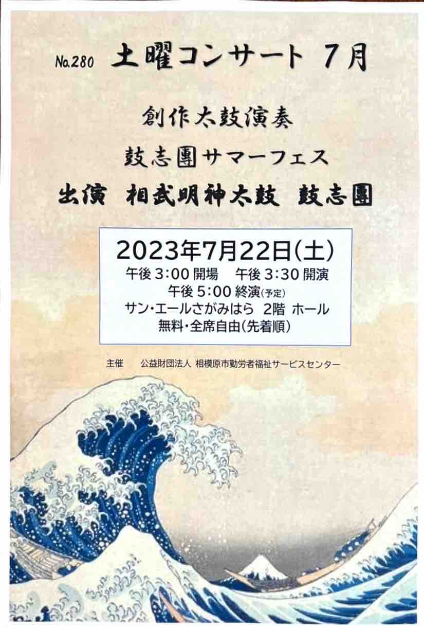 令和5年度の「サンエール土曜コンサート」…昨年に引き続き出演いたします…今回は「鼓志團サマーフェス」と題しまして、この暑い夏に向かってますます盛り上がっていこうと思っていますのでよろしくお願いします…また、8月6日(日)の15時から橋本七夕まつりでは4年ぶりに「鼓志團七夕ライブ」を開催いたしますのでこちらもよろしくお願いします…