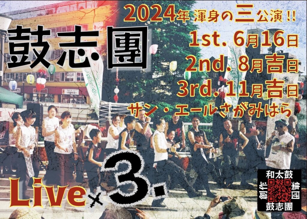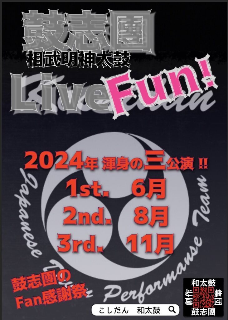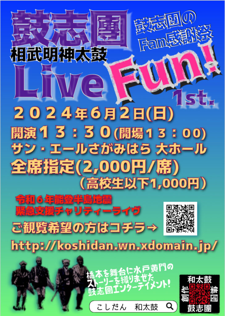 本年、第一回の目のライブは「2024鼓志團ライブ 1st FUN!」(令和6年能登半島地震に対する緊急支援)と銘打ち6月2日(日)13時~ サンエールさがみはら大ホールで開催いたします。   入場が出来なかった事例に鑑み、今回は指定席にさせていただきました。また、申し込みにつきましては下記の方法によりチャリティーファンド(2,000円 高校生以下1,000円)を添えて申し込み願います。なお、「2024鼓志團ライブ 2nd」(8月)「2024鼓志團ライブ 3rd」(11月)の詳細につきましては公演の二か月前からポスター、ホームページ等でお知らせします。