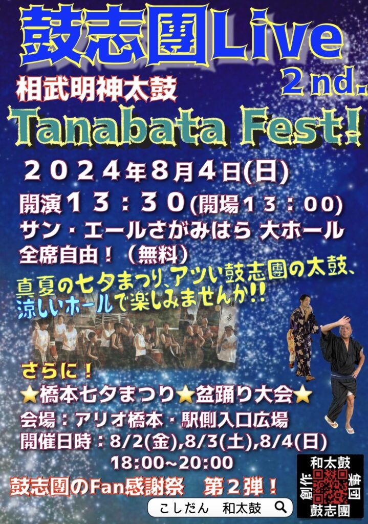 毎年開催してました橋本駅前ペデストリアンデッキでの「七夕ライブ」ですが、今年よりデッキが使用不可ということになり、サンエール大ホールで「2024鼓志團ライブ2nd 七夕ライブ」として開催しますのでよろしくお願いします…