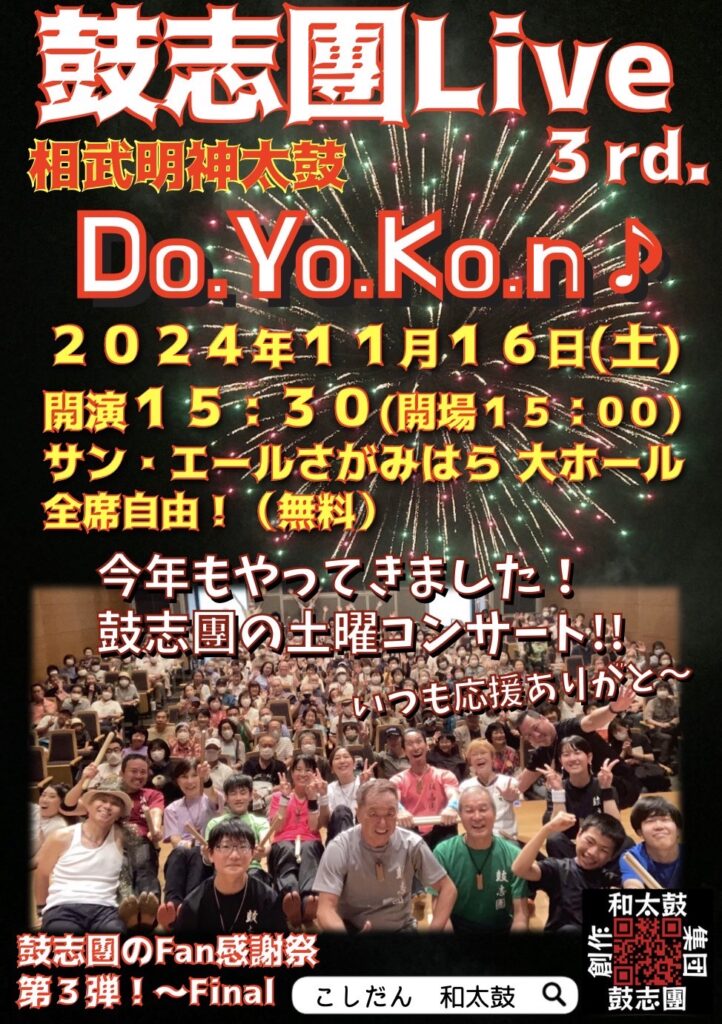 地域の盛り上げ隊「鼓志團」の活動の一つとして、今年は大勢の方に鼓志團のステージを見ていただこうと三回のライブステージを計画し…6月に鼓志團ライブ1st…8月に鼓志團ライブ2nd…そして3回目のライブはサンエール土曜コンサートとカップリング開催としまして「2024鼓志團ライブ3rd Do.Yo.Ko.n♪」を11月16日(土)15時30分…サンエールさがみはら大ホールで開催し、大勢の方とお会いすることができ各ライブとも最高に盛り上がった楽しいライブを開催することができました…ありがとうございました…来年もパワーアップした楽しいライブを開催したいと思っていますのでよろしくお願いします…